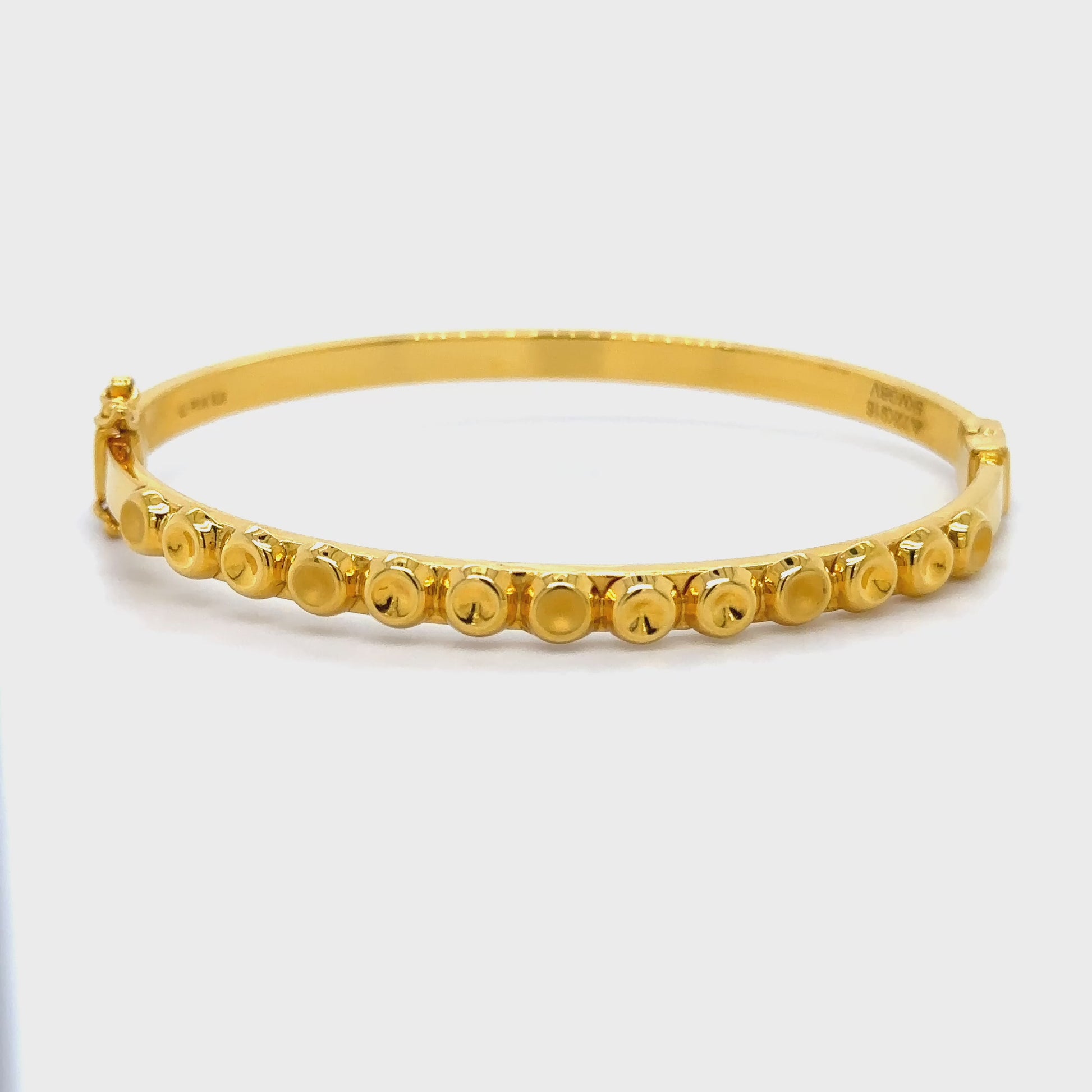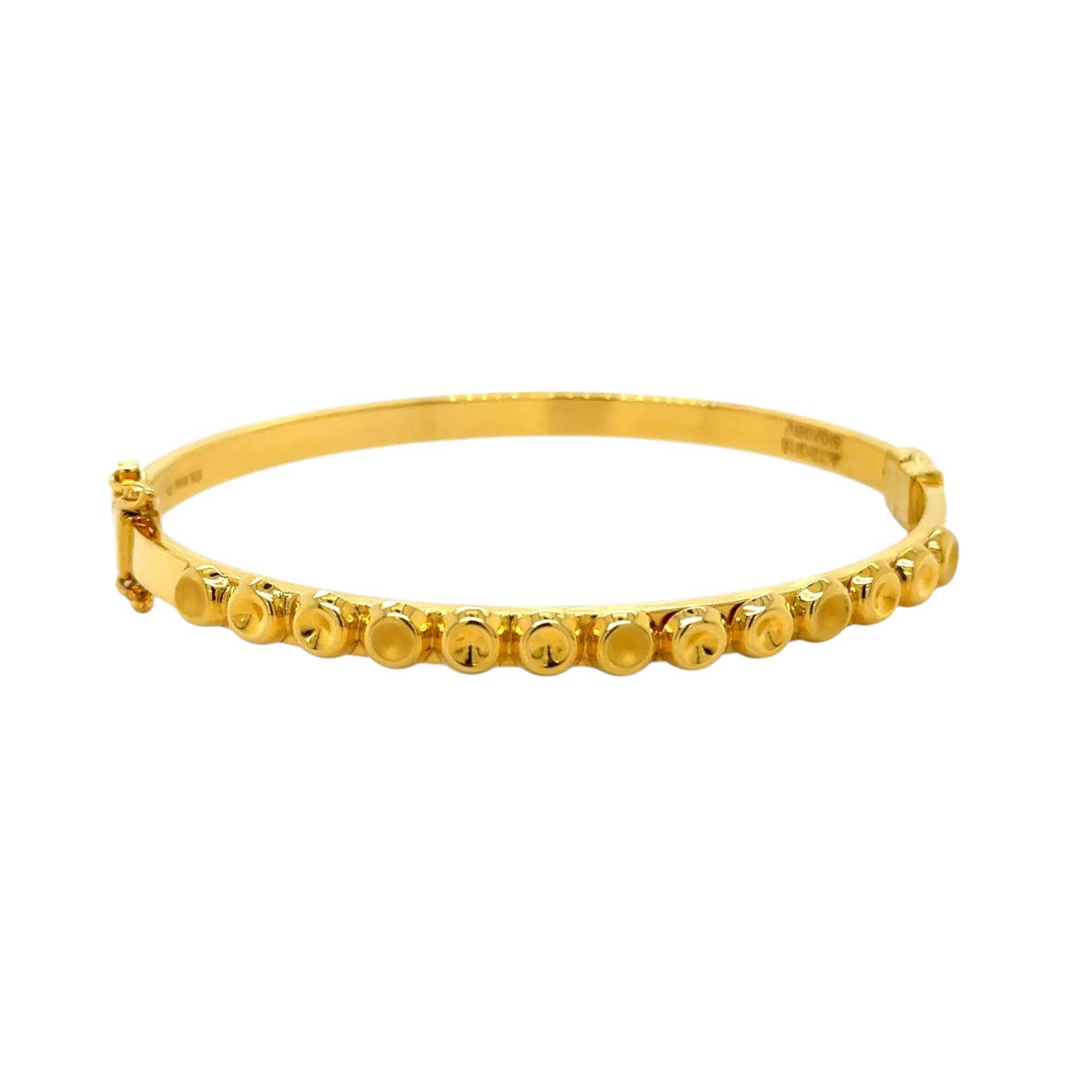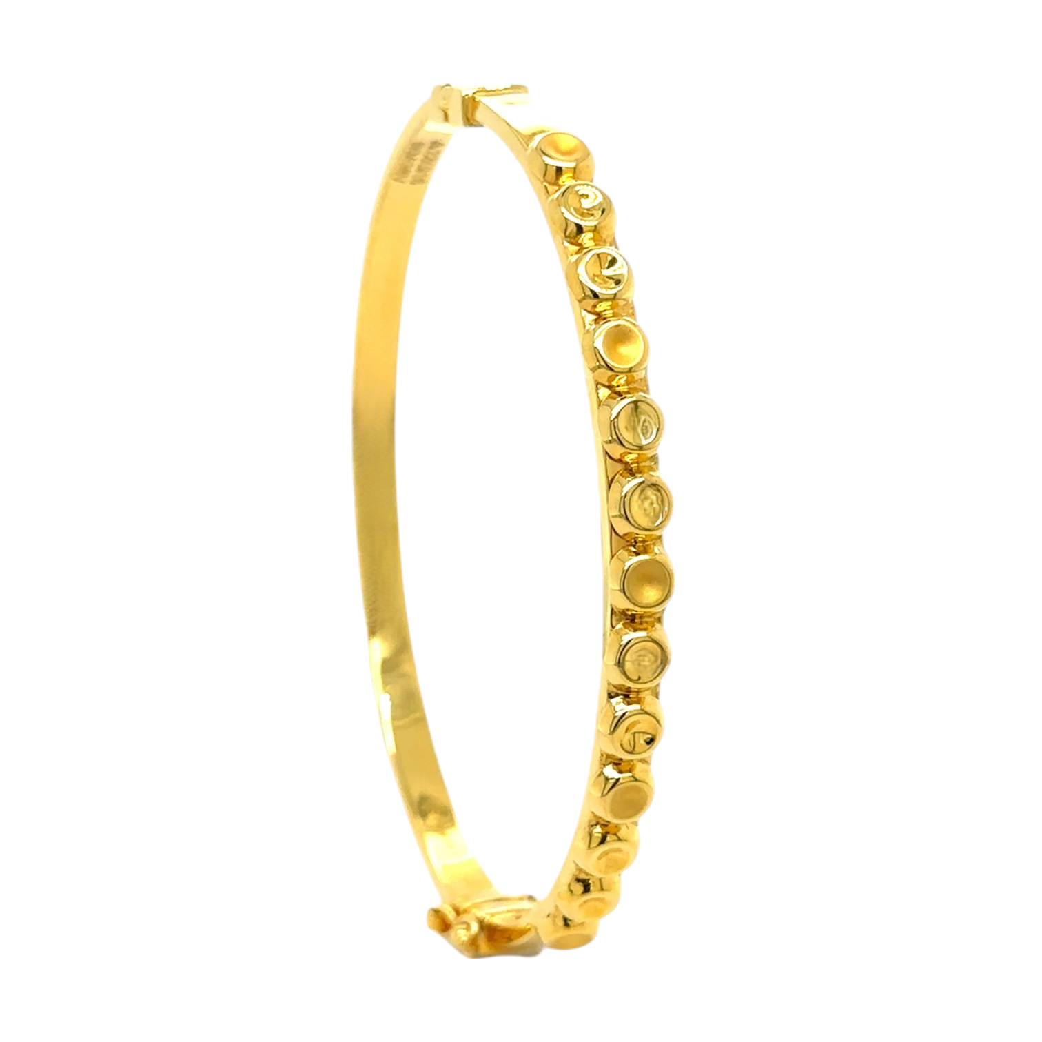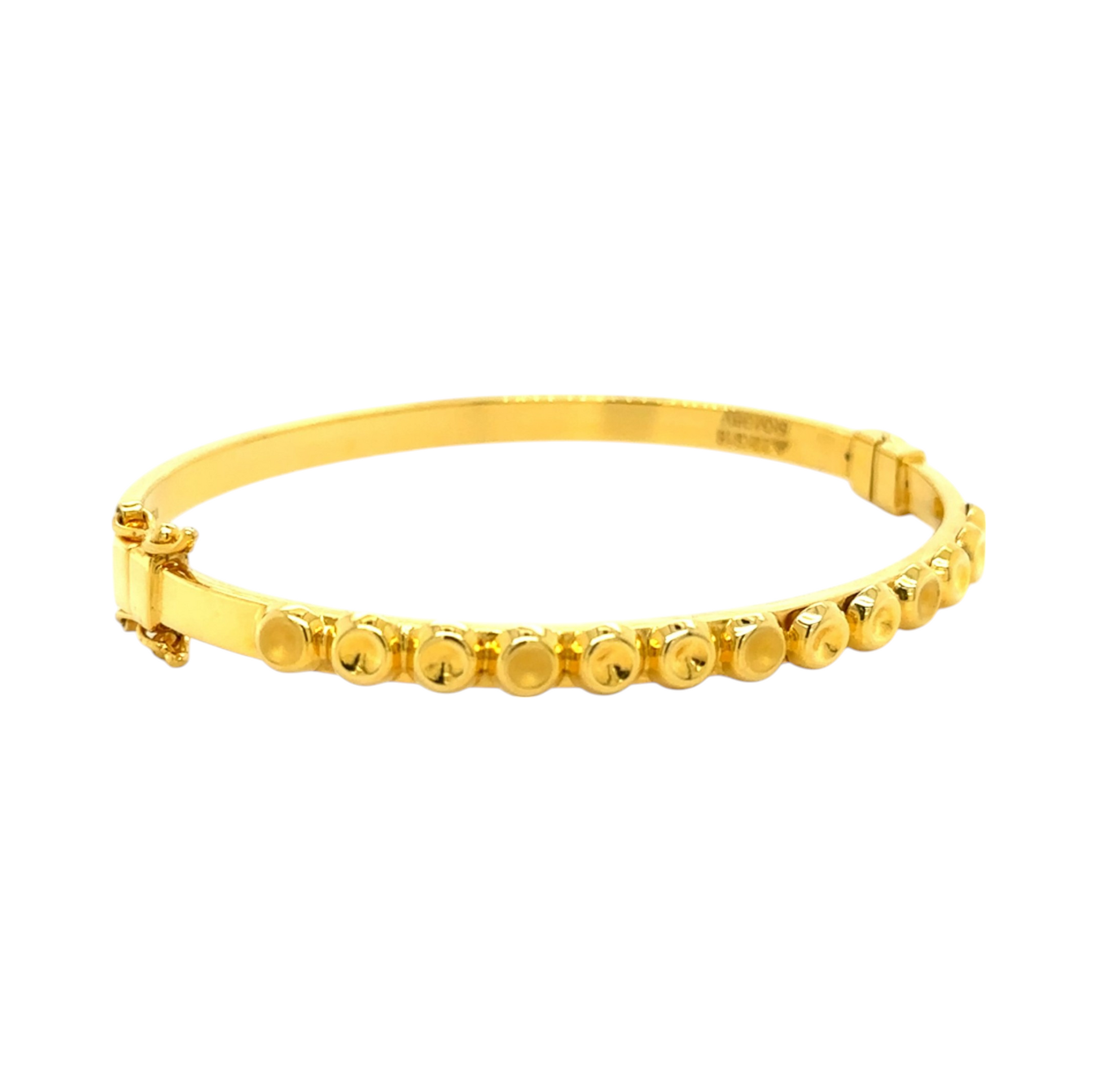 This sophisticated gold bracelet features a unique design of evenly spaced, circular gold motifs, creating a bold and elegant look. Its seamless finish and secure clasp make it perfect for both daily wear and festive occasions.