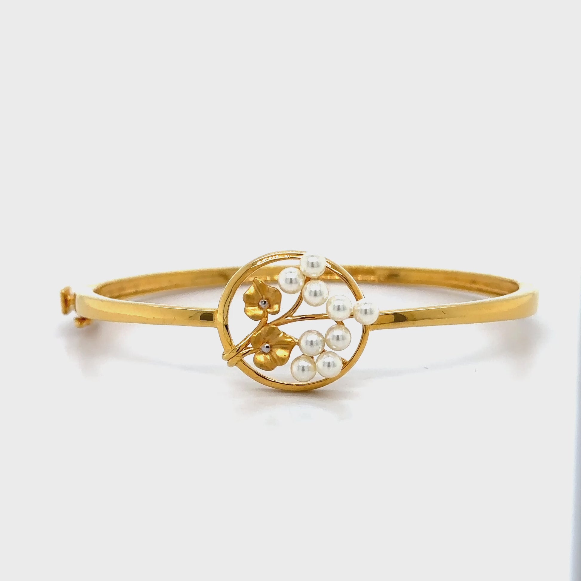 This charming gold bracelet showcases a circular floral motif adorned with delicate pearls, symbolizing elegance and grace. Its unique design and refined craftsmanship make it a versatile accessory for both casual and formal occasions.