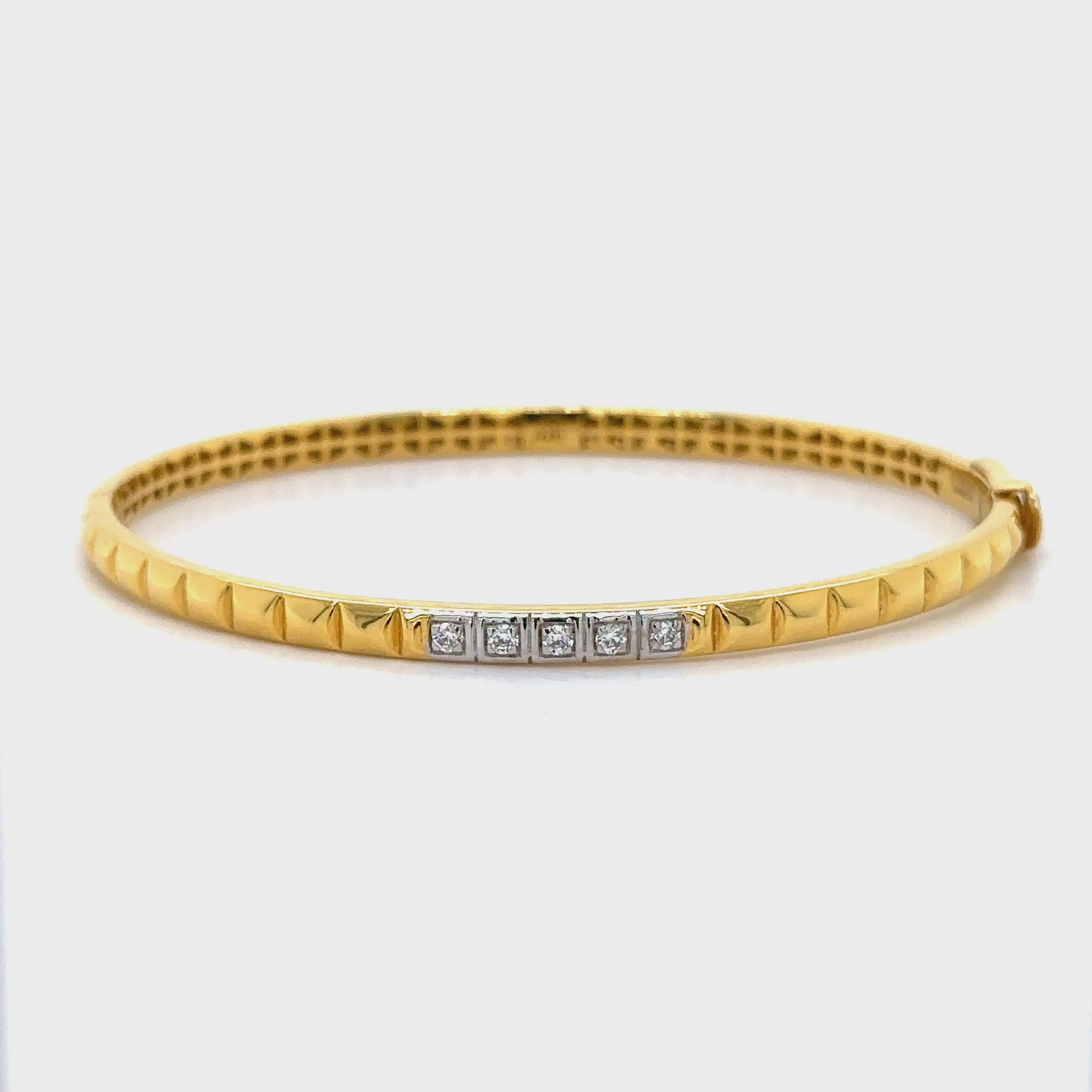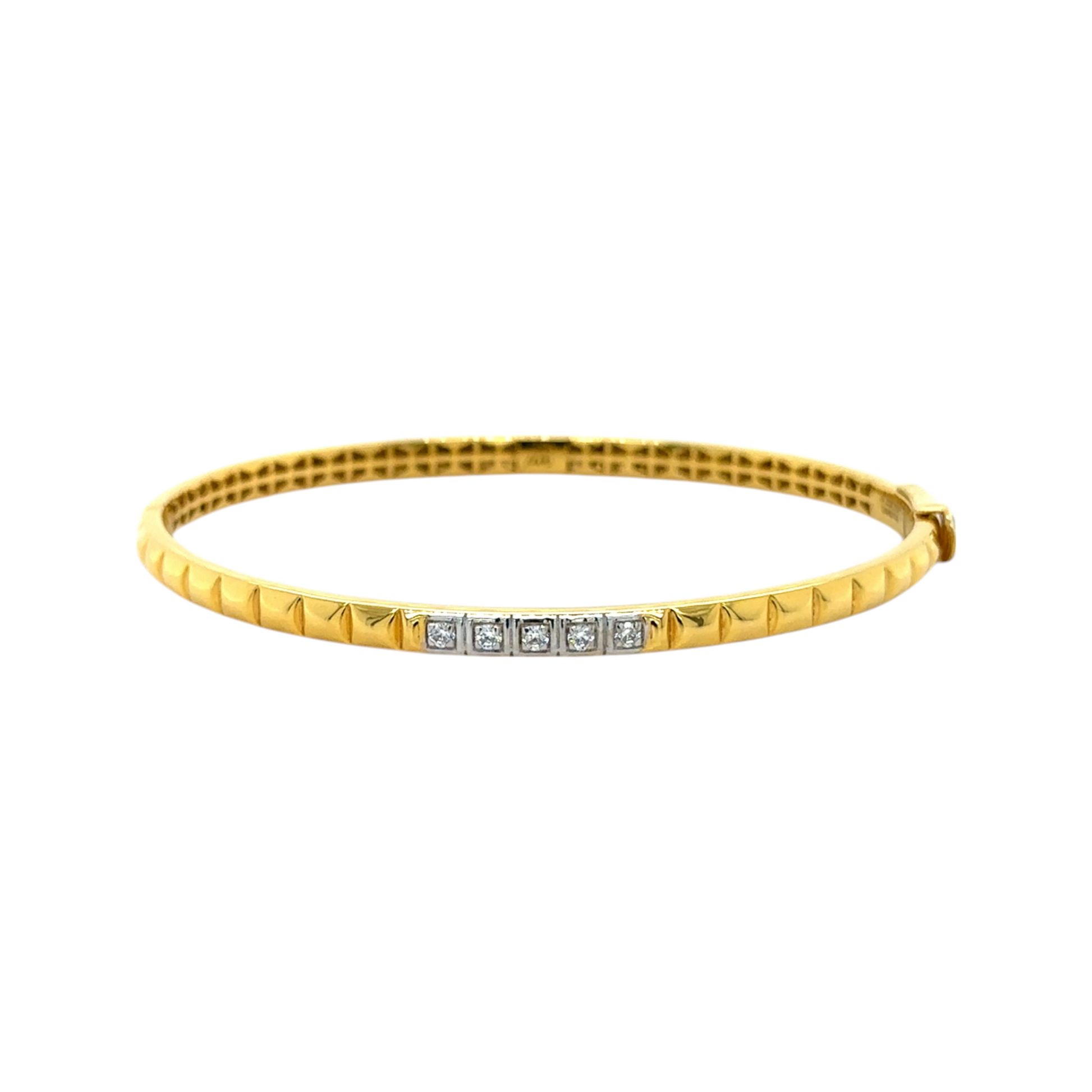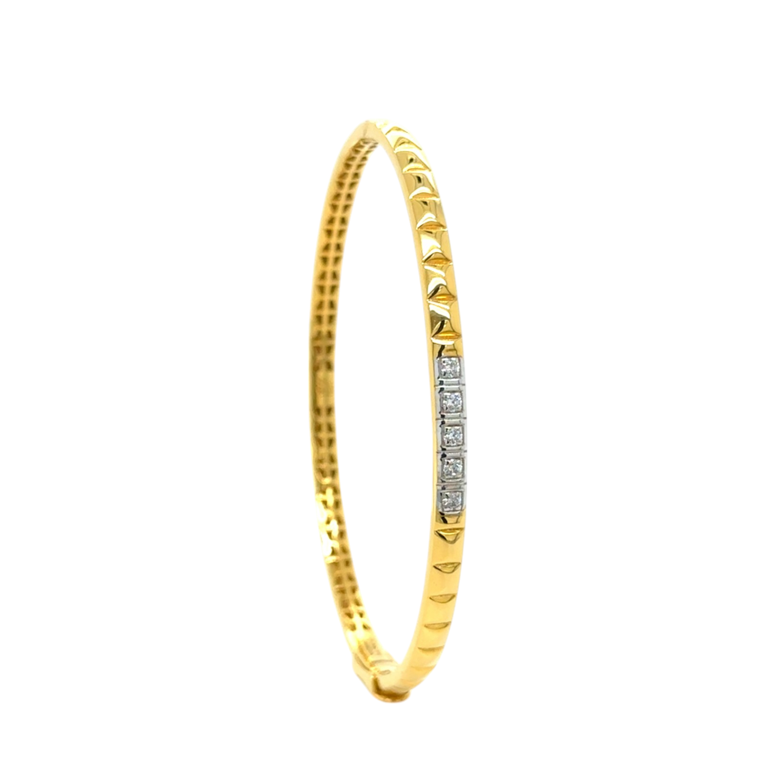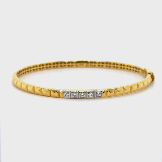 This sleek gold bracelet features a contemporary geometric design with pyramid-shaped patterns and a row of dazzling diamond accents. Its modern elegance and secure fit make it a perfect choice for any stylish occasion.
