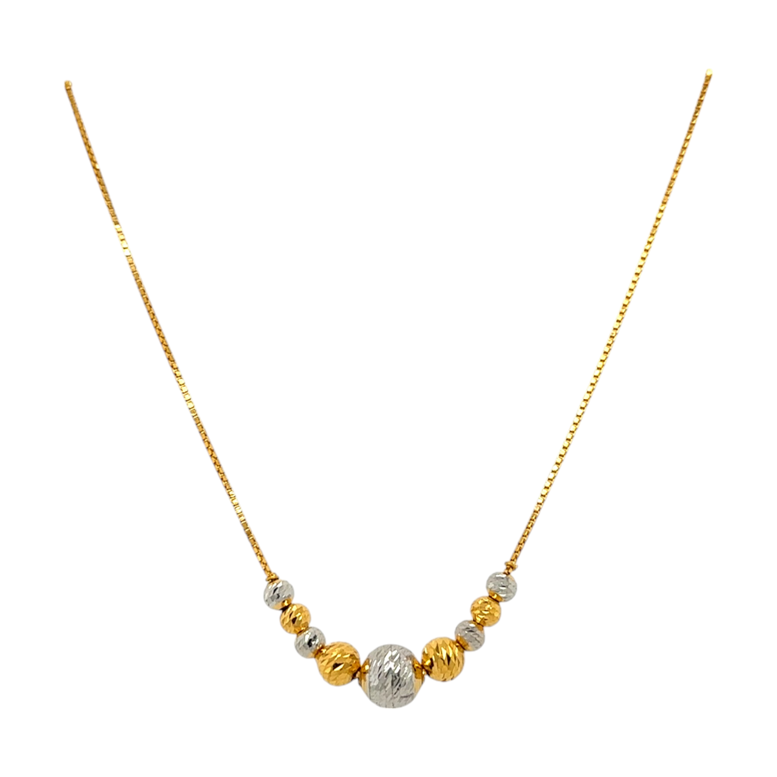 This graceful gold chain is adorned with alternating gold and silver-toned textured beads, culminating in a bold central bead. Its harmonious dual-tone design makes it an elegant choice for any occasion.