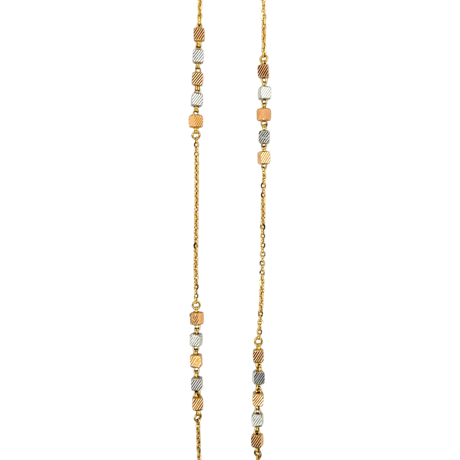 This elegant gold chain features alternating textured cubes in gold and silver tones, adding a playful yet sophisticated touch. Its unique design is perfect for enhancing both everyday looks and festive ensembles.